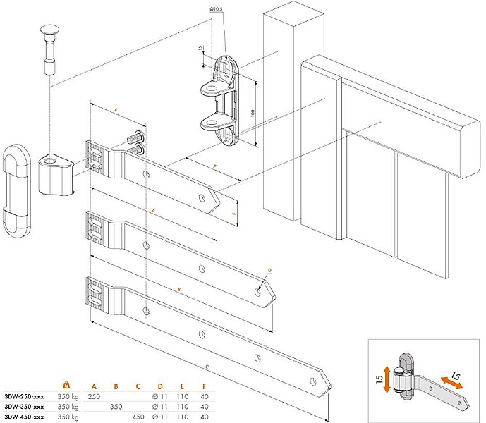 Locinox scharnier voor houten poorten 3-dimensioneel regelbaar 3DW. Roestvrijstalen scharnier voor houten poorten. Het scharnier is regelbaar in drie dimensies: hoogteregelbaarheid, links-rechts uitlijning en de draairichting. Ook verkrijgbaar met een warmbad gegalvaniseerde arm.