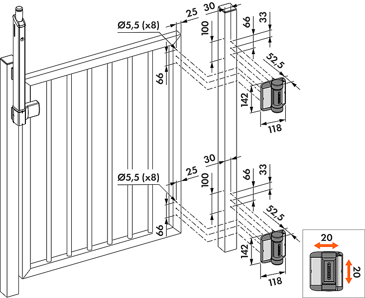 Locinox Serval is een compact veerscharnier met krachtregeling. Set van 2 stuks veerscharnieren. De met glasvezel versterkte PA-behuizing beschermt de hoogtechnologische interne componenten en garandeert een perfect functioneren in alle weersomstandigheden. De 20 mm horizontale en verticale verstelbaarheid verzekert een eenvoudige en flexibele installatie. Stevig verankerd met zelfborende schroeven - geen laswerk nodig. Geschikt voor installatie op vierkante en ronde profielen.