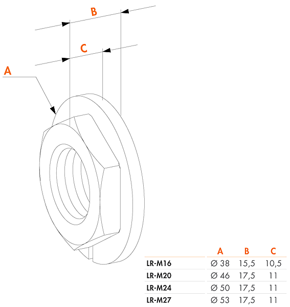 Regelbare lasmoer Voor M20 scharnierassen Elektrolytisch verzinkte regelmoer voor sierpoorten. Dit product laat toe de poort na montage haarfijn af te stellen. Dit product met artikelnummer P00005991 was vroeger bekend onder het artikelnummer LR-M20Dit product wordt per stuks verkocht.