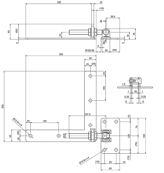 Verstelbaar poortscharnier 300 mm haaks SP-130M20-C