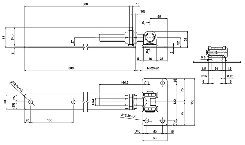 Verstelbaar poortscharnier 600 mm recht SP-130M24-B