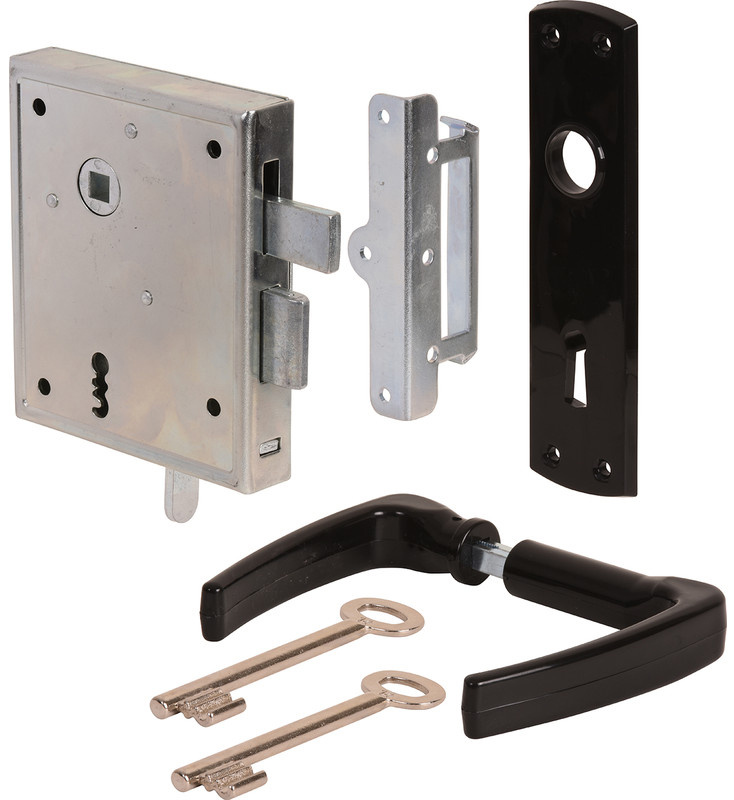 Poortslot 55/65 BB met bontebaardsleutel. DX-UKS BB 55/65. Dulimex opleg poortslot m/zwart kunststof krukstel; 1 schild Opschroevend dag en nachtslot, staal verzinkt. Met 2 bonte baardsleutels en sluitplaat/kom. Links en rechts bruikbaar met verende lichter (hefslot). Breedte x Hoogte x Dikte: 100 x 118 x 20 mm. Met nachtvergrendeling. Doornmaat: 60 mm Steekmaat: 55mm. EAN 8714140003907 Merk DX Leverancier 0160.095.5650