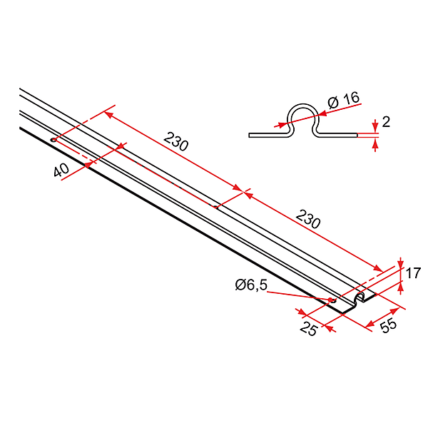 Omega rail voor rolpoorten op schuine helling. Looprail te bevestigen aan de grond met schroeven voor de poort (niet meegeleverd). Omega-vorm om eventuele scheefstand van de grond of poort op te vangen.