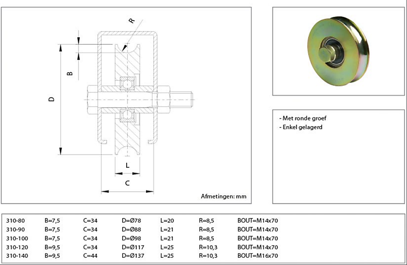 Enkel gelagerde wielen met ronde groef verkrijgbaar in diverse afmetingen. Enkel gelagerde wielen worden vaak gebruikt bij het maken en soepel laten lopen van rolpoorten.