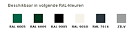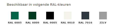 Verkrijgbaar in de kleuren RAL 6005, RAL 6009, RAL 9005, RAL 9010, RAL7016 en Zilver.