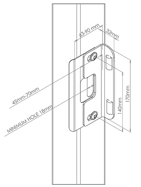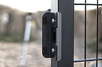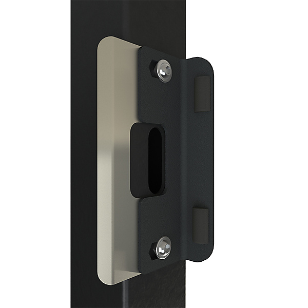 Platte slotvanger BSKG van gatemaster welke ook in past bij smalle ruimtes. Slank en onopvallend. Vereist minimale ruimte tussen de poort en de paal. Elegant uiterlijk met rvs sluitplaat.