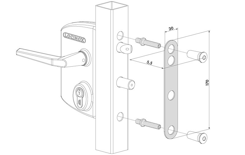 Roestvrijstalen geleidingsplaat voor een optimale pengeleiding van elk Locinox opbouwslot. Makkelijke installatie gegarandeerd.