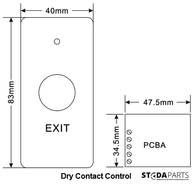 Draadloze drukknop 433Mhz Draadloze schakelaar of exit knop stedaparts. Werk met 433Mhz Rolling Code. Makkelijk te monteren en werkt op een 3032 Lithium batterij. Inclusief control panel welke op een 12V voeding aan te sluiten is.