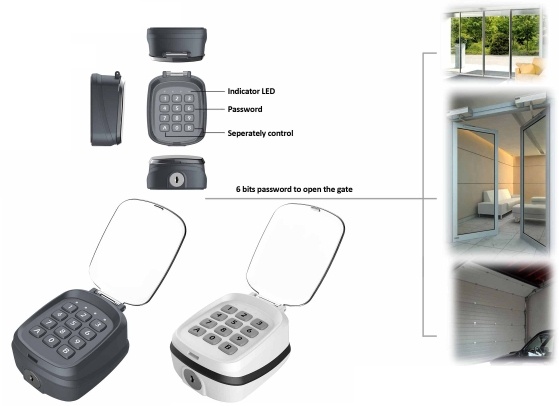 Draadloos universeel codepaneel wit of zwart. Bereik van deze draadloze zender keypad is ca.35m(binnen) en 100m(open veld). Codepaneel welke bijna alle bestaande handzenders in te leren