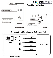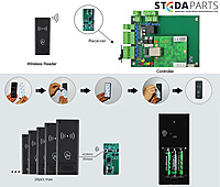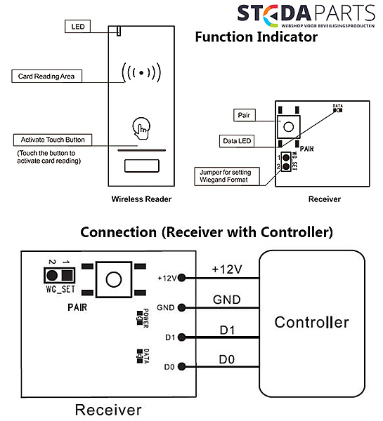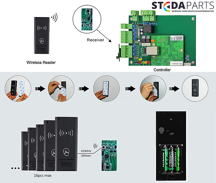 Draadloze kaartlezer of paslezer 433Mhz Stedaparts voor kaarttype 13,56 mifare. Draadloze wandlezer bestaat uit de lezer met een aparte ontvanger. 433Mhz Rolling Code. Er kunnen 16 lezers op 1 ontvanger ingeleerd worden. Het bereik van de ontvanger is ca 30 meter. De zender / wandlezer word gevoed door 3 AAA batterijen met een zeer laag batterij verbruik en is ip65 waterproef. Eenvoudig te onteren door de mee geleverde 3M plakstrip. Paslezer.