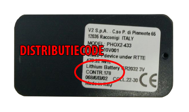 V2Home PHOX-4 handzender tbv Wally ontvanger (vervanger van TRC-4) Let op! Deze afstandsbedieningen zijn code afhankelijk. U kunt op de achterzijde de distributiecode vinden (zie foto 3).