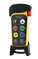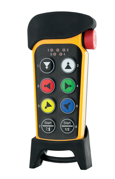 Handzender in een IP65 behuizing met clip, de zender beschikt over 8 2-staps knoppen en een actieve noodstop PLd. De handzender maakt gebruik van 3x 1,5V AAA batterijen.
