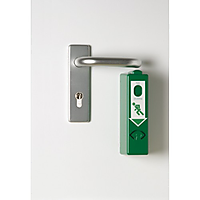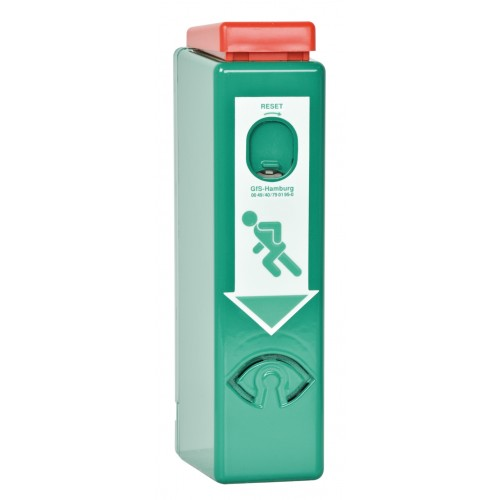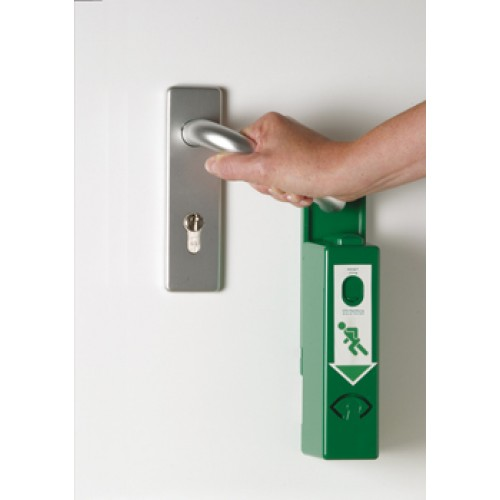 GfS Exit Control 179 met 95dB/1m alarm en vooralarm RAL 6029. De GfS Exit Control 179 wordt rechtstreeks onder de deurkruk of paniekstang bevestigd; zo is de deur rechtstreeks beveiligd. Echter in geval van nood is de deur te openen met slechts één handbeweging zoals de Europese Normering voorschrijft. Tijdens de eerste aanraking met de deurkruk, zal het vooralarm geactiveerd worden, bij geheel door drukken zal de GfS Exit Control 179 in een verticale beweging naar beneden schuiven en zal er een continu akoestisch alarm klinken, wat wijst op onbevoegd gebruik. Om de deur weer in zijn beschermende functie te plaatsen, is de GfS Exit Control 179 eenvoudig te resetten met de systeemsleutel. Tevens is op deze manier de GfS Exit Control 179 in een dagstand te plaatsen waardoor de deur normaal gebruikt kan worden. Bevoegde personen kunnen gebruik maken van de deursleutel zonder dat er een alarm zal klinken. Gecertificeerd volgens EN179