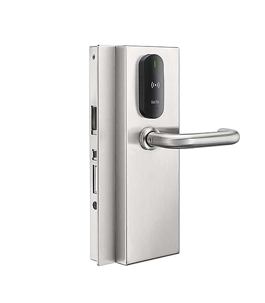 Salto EM654GD Elektronisch glasdeurbeslag DIN 18101 met 2 deurkrukken elk type Inclusief automatisch insteekslot met nachtschoot en sluitplaat voor framedeuren. Met mechanische cilinderuitsparing (cilinder niet inbegrepen). Technologie: Mifare + Bluetooth LE + HSE - Standaard krukstift, afwerkingen en deurkrukken.