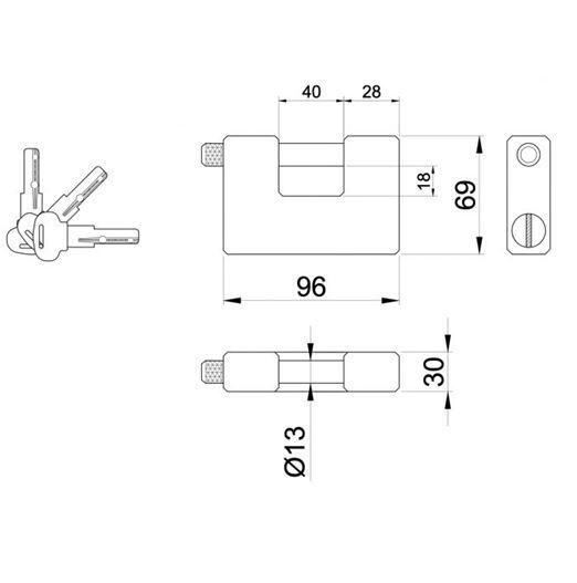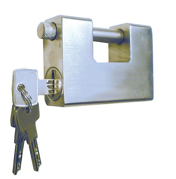 Blokslot met geharde as van IBFM artikelnummer 9993 BLSL03. Massief gepantserd blokslot. Geschikt voor het afsluiten van poorten, rolluiken, handbediende slagbomen en meer. De pennen zijn niet door te knippen omdat ze al moeilijk bereikbaar maar ook nog eens gehard zijn. BLS03