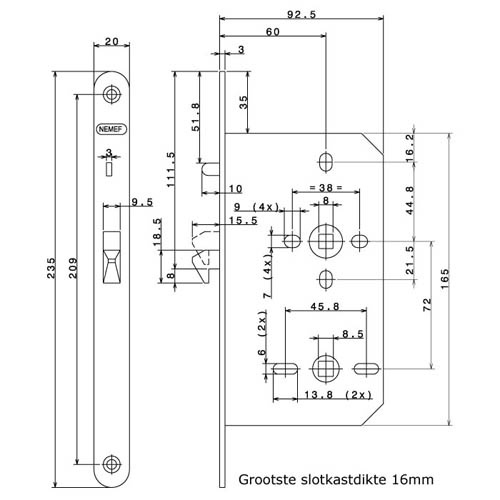 Nemef badkamerslot en wc-deuren Type 624. Geschikt voor toepassing in toilet- en badkamerschuifdeuren in de utiliteitsbouw.