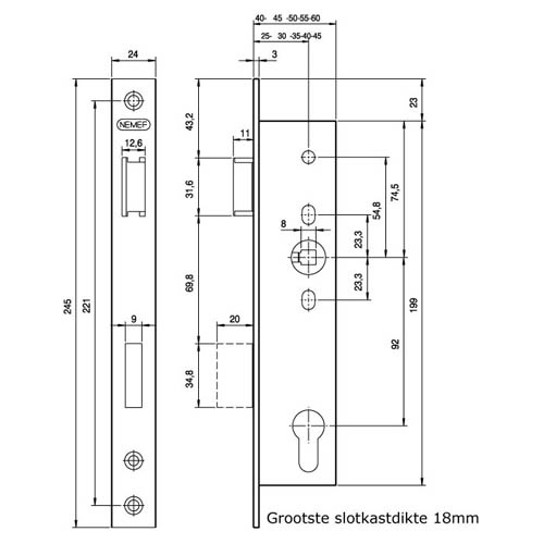 Nemef smalslot type 9600 Cilinder insteek smaldeur dag- en nachtslot. Dagschoot is omlegbaar voor zowel links als rechts draaiende deuren. Metalen en kunststof binnen- en buitendeuren in de utiliteitsbouw. Nemef smaldeursloten