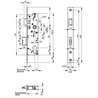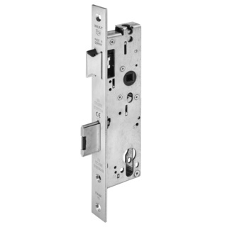Anti-paniek insteekslot voor 1-vleugelige profieldeuren, geschikt voor profielcilinders, wisselfunctie E, geïntegreerde functie ''ingestoken sleutel'', voorplaat edelstaal, 9 mm tuimelaar eendelig, met wissel, dagschoot omlegbaar, geleverd in DL, 1-toers = 20 mm nachtschootuitworp, slotkast compleet verzinkt, dagschoot en nachtschoot vernikkeld, doorlopende schroefgaten.