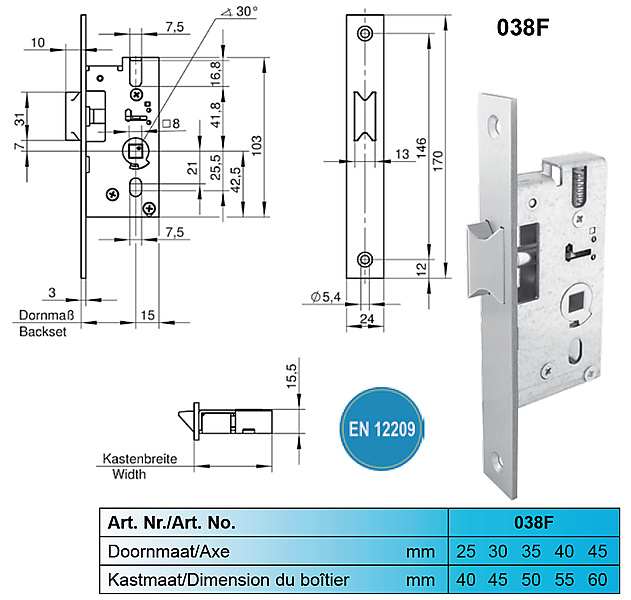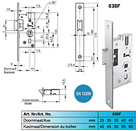 Wilka 038F loopslot met dagschoot. Insteekslot of dagschootslot voor profieldeuren compleet verzinkt met 8 mm tuimelaar eendelig met wissel. Dagschoot omlegbaar slotkast boven en beneden gesloten, doorlopende schroefgaten. Gekeurd conform EN 12 209.