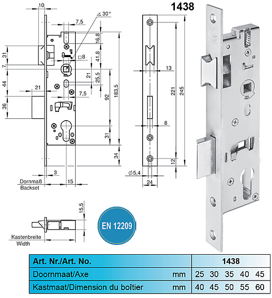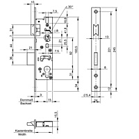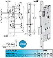 Wilka 1438 smaldeurslot. Insteekslot voor profieldeuren, geschikt voor profielcilinders, compleet verzinkt, 8 mm tuimelaar eendelig, met wissel, dagschoot omlegbaar, 1-toers = 20 mm nachtschootuitworp, slotkast boven en beneden gesloten, doorlopende schroefgaten. Gekeurd conform EN12209.