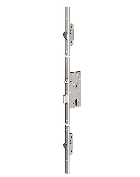 EL567 Abloy solenoid zelfvergrendelende meerpuntssluiting. Zelfvergrendelend 3-punt paniekslot voorzien van twee haken en dag- en nachtschoot - Vierkante roestvrijstalen voorplaat. Automatische vergrendeling van alle schoten en dagschootblokkering door veervoorspanning na het sluiten van de deur en na positionering door de stuurschoot ? Ontgrendeling via de cilinder, via een elektronische puls of met stroomonderbreking kan de stuurbare kruk gekoppeld worden (de gebruiker dient wel nog de kruk te bedienen).