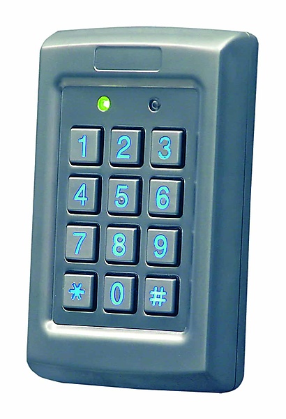 Metalen, anti-vandalisme codeklavier - blauw verlicht codepaneel - met ingegoten electronica IP65 (geen afzonderlijke centrale) - geheugen tot 500 gebruikers - voorzien van 2 relaisuitgangen (aansluitspanning 12-24V AC/DC)