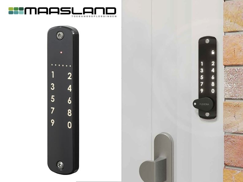 Maasland GTS100 Flexeria codetableau en paslezer t.b.v. Flexeria Motorcilinder. Fraai vormgegeven, smal en intelligent codetableau met gentegreerde MIFARE paslezer voor het draadloos openen en/of sluiten van de Flexeria motorcilinder, oplegslot, kettingdeuropener en deurcontroller.
