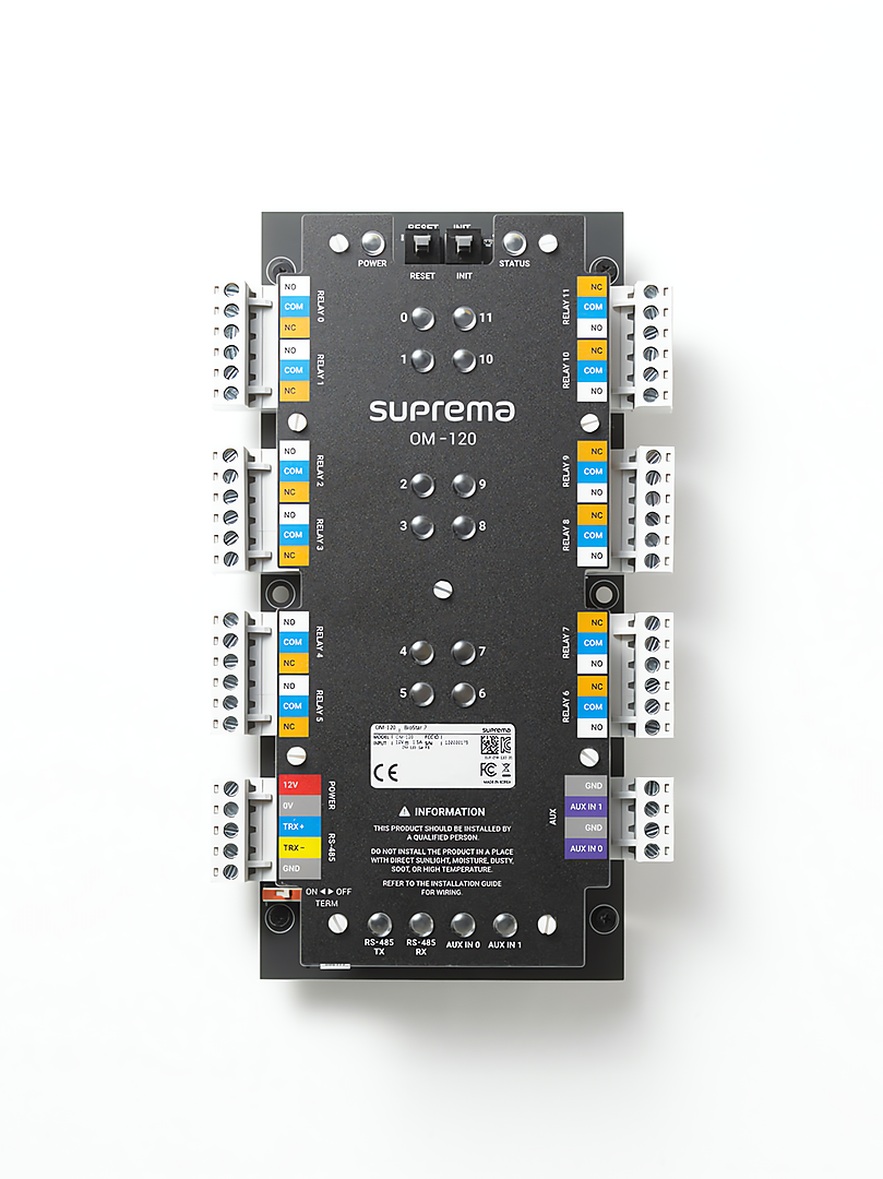 De Suprema OM-120 Uitgangsmodule is een uitbreidingsmodule met meerdere uitgangen die tot 12 uitgangsrelais kan aansturen. Het kan ook worden gebruikt als liftcontroller met het BioStar 2-systeem. Er kunnen in totaal 31 units worden aangesloten op een masterapparaat via RS485 daisy chain. De uitgangsmodule heeft ook een anti-passbackfunctie en een brandalarmfunctie.
