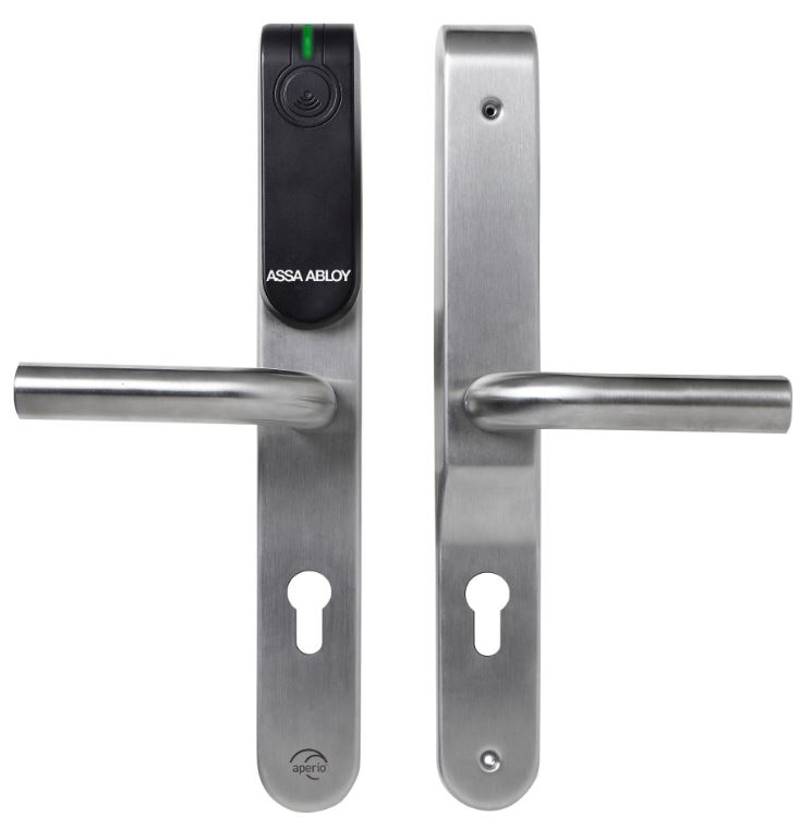 Aperio E100P elektronisch deurbeslag IP54 offline/online met RFID HF + BLE - 5011-BC9K11212- Aperio V3 premium beslagset met U-kruk, IP54, online/OSS offline, BLE, PC92, voor 40 - 45mm deur en 9mm krukstift. ISO 14443 A/B.