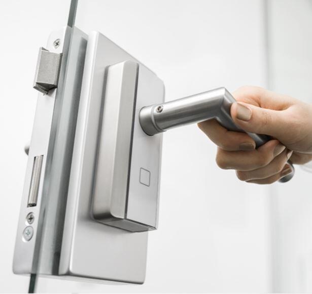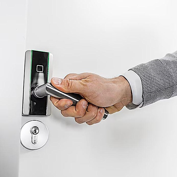 dormakaba c-lever compact elektronisch beslag. Het elektronisch deurschild c-lever compact is perfect geschikt voor glas- en kantoordeuren in binneruimten. Dankzij onze draadloze oplossing kunt u genieten van toegang op afstand tot uw toegangssysteem en kunt u de c-lever compact beheren en onderhouden vanaf het comfort van uw bureau.