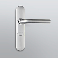 SimonsVoss Smart Handle, elektronisch beslag. Het digitale deurbeslag regelt de toegang voor gebruikers, exact onderscheiden naar rechten, locatie en tijd. De stroomverzorging voor max. 150.000 activeringen geschiedt met behulp van geïntegreerde knoopcellen die ca. 10 jaar lang zeker functioneren.