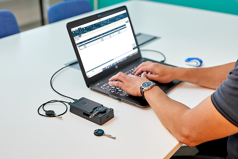 Iloq S5/S50 Desktop programmeer adapter. De Iloq bureauversie van de programmeeradapter om sleutels en cilinders te programmeren bestaat uit een programmeertoken met programmeerkabel en een kastje om de te programmeren sleutel op te leggen.