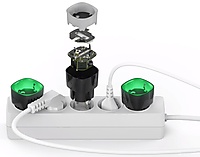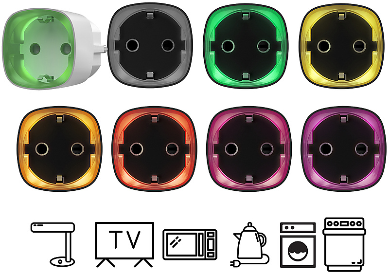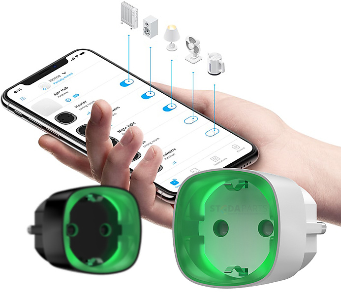 Ajax Socket Draadloze slimme stekker. Een draadloze tussenstekker met energiemonitor voor het schakelen van elektrische apparaten. De ring aan de voorzijde van de slimme stekker geeft met verschillende kleuren het verbruik van het aangesloten apparaat weer. De maximale belasting van deze plug bedraagt 2,5 kW en is uitgerust met overspanningsbeveiliging, energieverbruiksmeter en een vermogens-indicator. De Socket / slimme steller maakt gebruik van Jeweller long range radio technologie voor een stabiele communicatie.