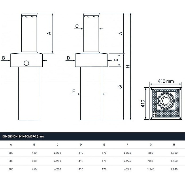 Fadini VIGILO hydraulische verkeerspaal Ø200mm wanddikte 4mm met ingebouwde hydraulische unit, handmatige ontgrendeling mogelijk Hydraulische palen worden standaard geleverd zonder verlichting Vaste palen VIGILO: 200 mm verlengd om in te storten. Met de Fadini VIGILO hydraulische bollard regel je eenvoudig en veilig de toegang tot jouw terrein. Of het nu gaat om een woongebied, bedrijventerrein of industriële zone: deze volledig verzinkbare hydraulische bollard biedt betrouwbare bescherming tegen ongewenst verkeer. Dankzij het robuuste ontwerp en de geavanceerde technologie is de VIGILO geschikt voor intensief dagelijks gebruik – tot wel 2.000 cycli per dag.