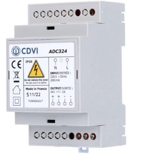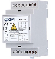 CDVI ADC324 Din Rail Voeding 24VDC 2A. F0305000007. De ADC324 is een compacte gereguleerde lineaire Din-rail voeding. Met zijn afmeting van 3 modules is dit een heel compacte maar stevige 2A voeding. Zijn gereguleerde uitgang garandeert altijd 24VDC ongeacht een hoge of een lage belasting. Hiermee is deze voeding geschikt voor toestellen die weinig tolerantie toestaan op hun ingangsspanning zoals electronica.