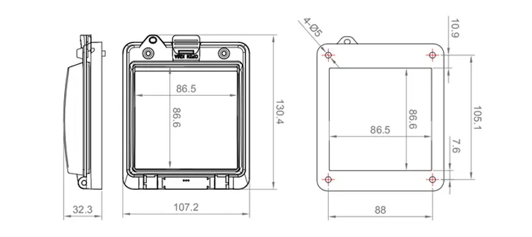 Waterdichte lichtgewicht afdekkap IP67 met interne ruimte van 86,5x86,5mm. Dit afdekvenster voorkomt binnendringen van water en heeft doorzichtig plastic venster.